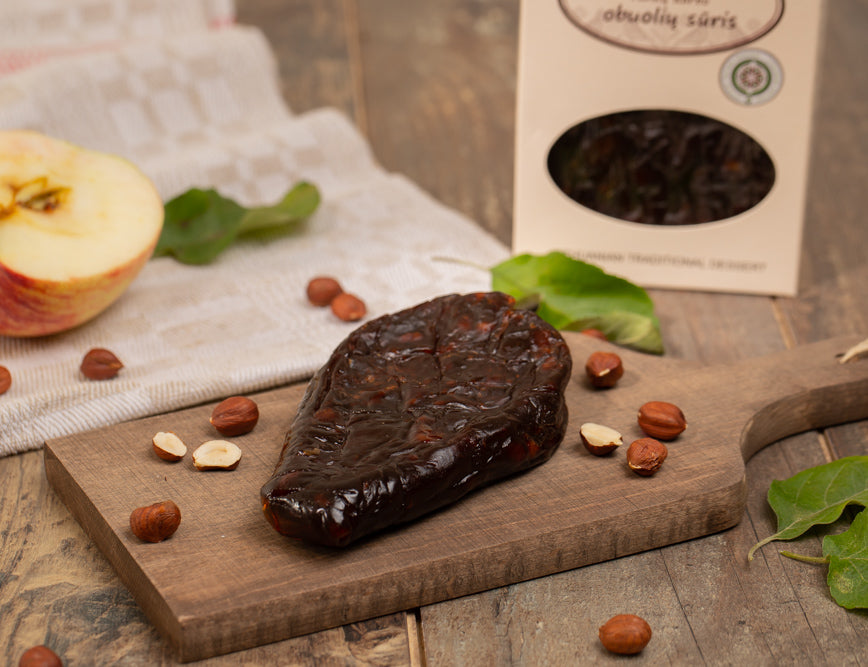 Rankų darbo, brandintas obuolių sūris iš išskirtinės kokybės, lietuviškų obuolių, pagardintas žemės riešutais.